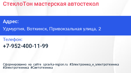 СтеклоТон, мастерская автостекол по адресу Удмуртия, Воткинск, Привокзальная улица, 2 в дальнейшем Организация, размещена в следующих категориях: