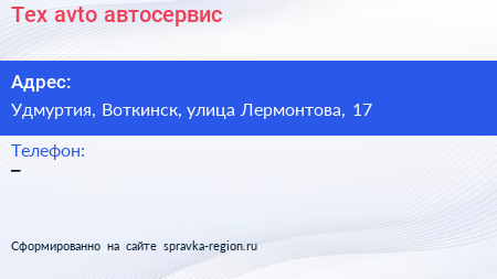 Tex avto, автосервис по адресу Удмуртия, Воткинск, улица Лермонтова, 17 в дальнейшем Организация, размещена в следующих категориях: