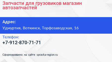 Запчасти для грузовиков, магазин автозапчастей по адресу Удмуртия, Воткинск, Торфозаводская, 16 в дальнейшем Организация, размещена в следующих категориях: