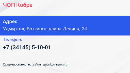 ЧОП Кобра по адресу Удмуртия, Воткинск, улица Ленина, 24 в дальнейшем Организация, размещена в следующих категориях: