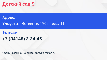Детский сад №5 по адресу Удмуртия, Воткинск, 1905 Года, 11 в дальнейшем Организация, размещена в следующих категориях: