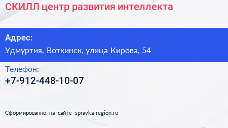 СКИЛЛ, центр развития интеллекта по адресу Удмуртия, Воткинск, улица Кирова, 54 в дальнейшем Организация, размещена в следующих категориях: