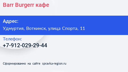 Barr Burgerr, кафе по адресу Удмуртия, Воткинск, улица Спорта, 11 в дальнейшем Организация, размещена в следующих категориях: