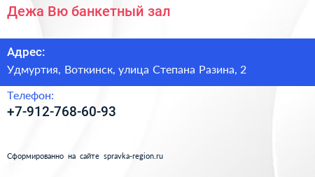 Дежа Вю, банкетный зал по адресу Удмуртия, Воткинск, улица Степана Разина, 2 в дальнейшем Организация, размещена в следующих категориях:
