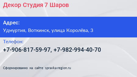 Декор-Студия 7 Шаров по адресу Удмуртия, Воткинск, улица Королёва, 3 в дальнейшем Организация, размещена в следующих категориях: