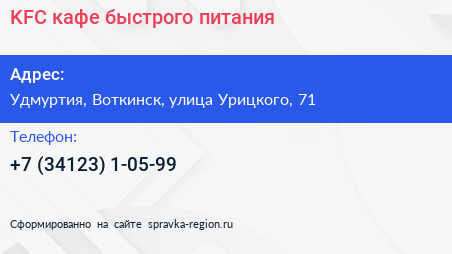 KFC, кафе быстрого питания по адресу Удмуртия, Воткинск, улица Урицкого, 71 в дальнейшем Организация, размещена в следующих категориях: