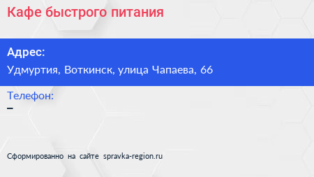 Кафе быстрого питания по адресу Удмуртия, Воткинск, улица Чапаева, 66 в дальнейшем Организация, размещена в следующих категориях: