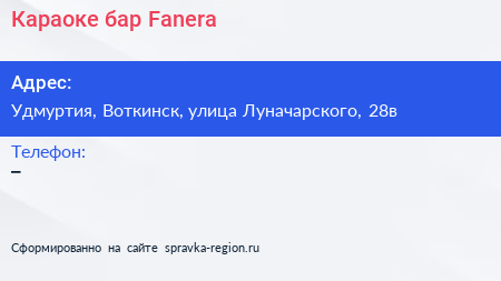 Караоке бар Fanera по адресу Удмуртия, Воткинск, улица Луначарского, 28в в дальнейшем Организация, размещена в следующих категориях: