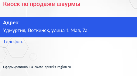 Киоск по продаже шаурмы по адресу Удмуртия, Воткинск, улица 1 Мая, 7а в дальнейшем Организация, размещена в следующих категориях: