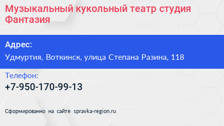 Музыкальный кукольный театр-студия Фантазия по адресу Удмуртия, Воткинск, улица Степана Разина, 118 в дальнейшем Организация, размещена в следующих категориях: