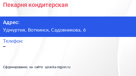 Пекарня кондитерская по адресу Удмуртия, Воткинск, Садовникова, 6 в дальнейшем Организация, размещена в следующих категориях:
