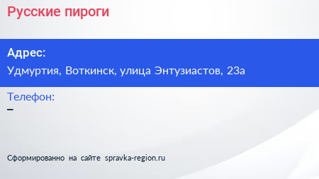 Русские пироги по адресу Удмуртия, Воткинск, улица Энтузиастов, 23а в дальнейшем Организация, размещена в следующих категориях: