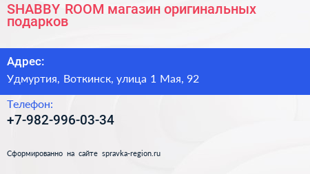 SHABBY ROOM, магазин оригинальных подарков по адресу Удмуртия, Воткинск, улица 1 Мая, 92 в дальнейшем Организация, размещена в следующих категориях: