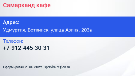 Самарканд, кафе по адресу Удмуртия, Воткинск, улица Азина, 203а в дальнейшем Организация, размещена в следующих категориях: