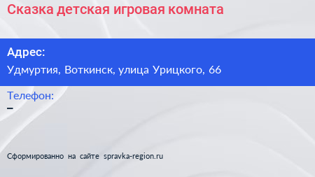 Сказка, детская игровая комната по адресу Удмуртия, Воткинск, улица Урицкого, 66 в дальнейшем Организация, размещена в следующих категориях: