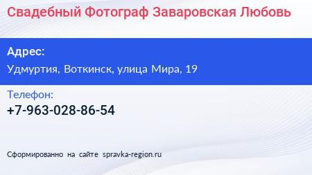 Свадебный Фотограф Заваровская Любовь по адресу Удмуртия, Воткинск, улица Мира, 19 в дальнейшем Организация, размещена в следующих категориях: