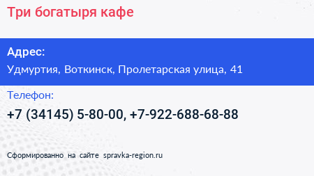 Три богатыря, кафе по адресу Удмуртия, Воткинск, Пролетарская улица, 41 в дальнейшем Организация, размещена в следующих категориях: