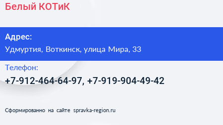 Белый КОТиК по адресу Удмуртия, Воткинск, улица Мира, 33 в дальнейшем Организация, размещена в следующих категориях: