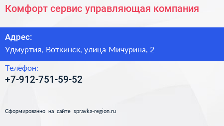 Комфорт сервис, управляющая компания по адресу Удмуртия, Воткинск, улица Мичурина, 2 в дальнейшем Организация, размещена в следующих категориях: