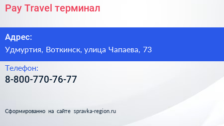 Pay. Travel, терминал по адресу Удмуртия, Воткинск, улица Чапаева, 73 в дальнейшем Организация, размещена в следующих категориях:
