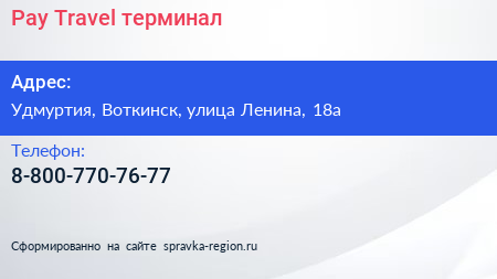 Pay. Travel, терминал по адресу Удмуртия, Воткинск, улица Ленина, 18а в дальнейшем Организация, размещена в следующих категориях: