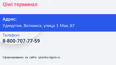 Qiwi, терминал по адресу Удмуртия, Воткинск, улица 1 Мая, 87 в дальнейшем Организация, размещена в следующих категориях: