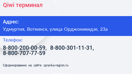 Qiwi, терминал по адресу Удмуртия, Воткинск, улица Орджоникидзе, 23а в дальнейшем Организация, размещена в следующих категориях: