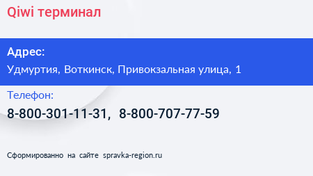 Qiwi, терминал по адресу Удмуртия, Воткинск, Привокзальная улица, 1 в дальнейшем Организация, размещена в следующих категориях: