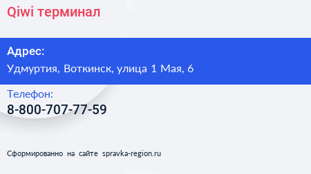 Qiwi, терминал по адресу Удмуртия, Воткинск, улица 1 Мая, 6 в дальнейшем Организация, размещена в следующих категориях:
