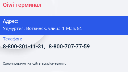 Qiwi, терминал по адресу Удмуртия, Воткинск, улица 1 Мая, 81 в дальнейшем Организация, размещена в следующих категориях: