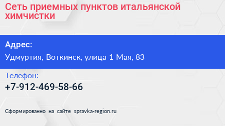 Сеть приемных пунктов итальянской химчистки по адресу Удмуртия, Воткинск, улица 1 Мая, 83 в дальнейшем Организация, размещена в следующих категориях: