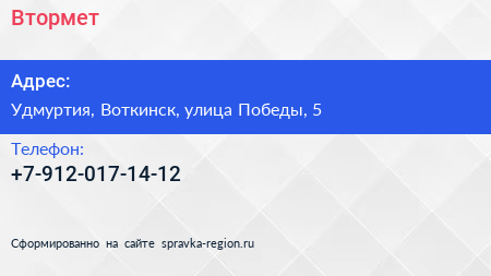 Втормет по адресу Удмуртия, Воткинск, улица Победы, 5 в дальнейшем Организация, размещена в следующих категориях: