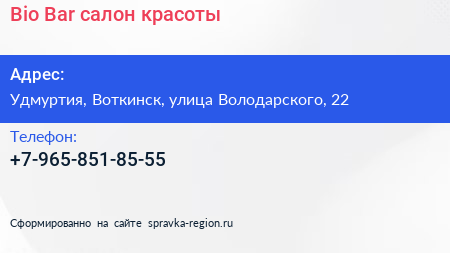 Bio-Bar, салон красоты по адресу Удмуртия, Воткинск, улица Володарского, 22 в дальнейшем Организация, размещена в следующих категориях: