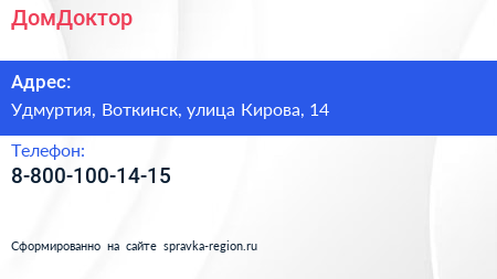 ДомДоктор по адресу Удмуртия, Воткинск, улица Кирова, 14 в дальнейшем Организация, размещена в следующих категориях: