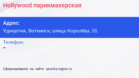 Hollywood, парикмахерская по адресу Удмуртия, Воткинск, улица Королёва, 31 в дальнейшем Организация, размещена в следующих категориях: