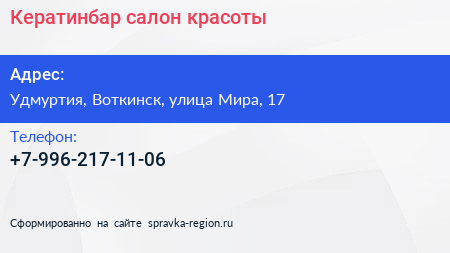 Кератинбар, салон красоты по адресу Удмуртия, Воткинск, улица Мира, 17 в дальнейшем Организация, размещена в следующих категориях: