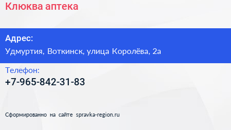 Клюква, аптека по адресу Удмуртия, Воткинск, улица Королёва, 2а в дальнейшем Организация, размещена в следующих категориях: