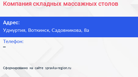 Компания складных массажных столов по адресу Удмуртия, Воткинск, Садовникова, 8а в дальнейшем Организация, размещена в следующих категориях: