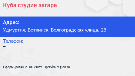 Куба, студия загара по адресу Удмуртия, Воткинск, Волгоградская улица, 28 в дальнейшем Организация, размещена в следующих категориях: