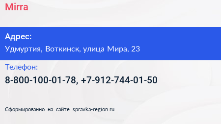 Mirra по адресу Удмуртия, Воткинск, улица Мира, 23 в дальнейшем Организация, размещена в следующих категориях: