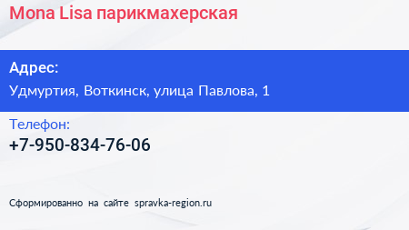 Mona Lisa, парикмахерская по адресу Удмуртия, Воткинск, улица Павлова, 1 в дальнейшем Организация, размещена в следующих категориях: