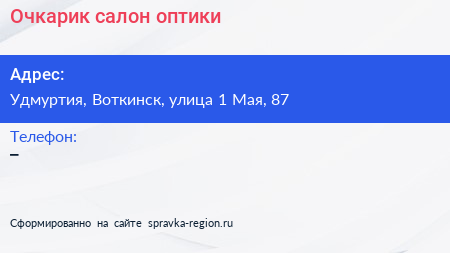 Очкарик, салон оптики по адресу Удмуртия, Воткинск, улица 1 Мая, 87 в дальнейшем Организация, размещена в следующих категориях: