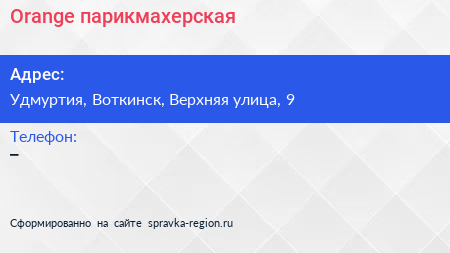 Orange, парикмахерская по адресу Удмуртия, Воткинск, Верхняя улица, 9 в дальнейшем Организация, размещена в следующих категориях: