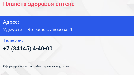 Планета здоровья, аптека по адресу Удмуртия, Воткинск, Зверева, 1 в дальнейшем Организация, размещена в следующих категориях: