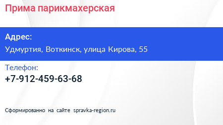 Прима, парикмахерская по адресу Удмуртия, Воткинск, улица Кирова, 55 в дальнейшем Организация, размещена в следующих категориях: