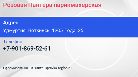 Розовая Пантера, парикмахерская по адресу Удмуртия, Воткинск, 1905 Года, 25 в дальнейшем Организация, размещена в следующих категориях: