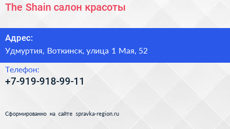 The Shain, салон красоты по адресу Удмуртия, Воткинск, улица 1 Мая, 52 в дальнейшем Организация, размещена в следующих категориях: