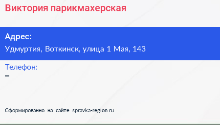 Виктория, парикмахерская по адресу Удмуртия, Воткинск, улица 1 Мая, 143 в дальнейшем Организация, размещена в следующих категориях: