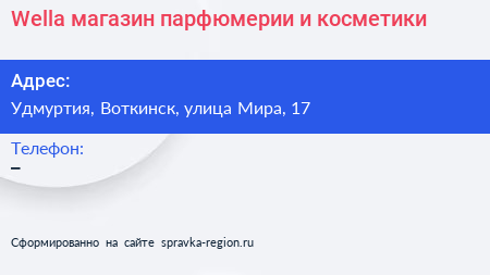 Wella, магазин парфюмерии и косметики по адресу Удмуртия, Воткинск, улица Мира, 17 в дальнейшем Организация, размещена в следующих категориях: