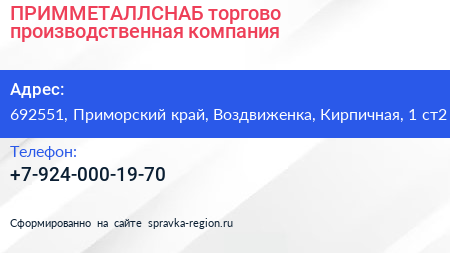 ПРИММЕТАЛЛСНАБ, торгово-производственная компания по адресу 692551, Приморский край, Воздвиженка, Кирпичная, 1 ст2 в дальнейшем Организация, размещена в следующих категориях: